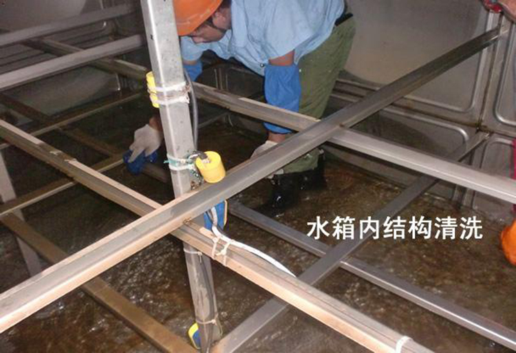 使用专业清洗设备对水箱进行清洗,重点部位进行手工擦洗。
